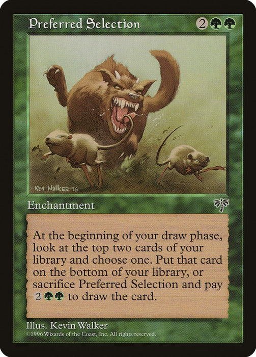 - Rules Text Contains: At the beginning of your draw phase, look at the top two cards of your library and choose one. Put that card on the bottom of your library, or sacrifice Preferred Selection and pay 2GG to draw the card.